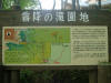 この看板から約5分で滝です、上滝が45m、下滝が40m |